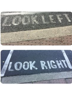 This may sound silly but one of the first things I had to do was to remember to look both ways before crossing the street. Of course all us are taught this from a young age but decades of experience told me to look in the direction I knew the cars would be coming from before I stepped off the curb. Now all the sudden the rules had changed. The steering wheel is on the right side of the car now too and instead of driving on the right side of the road it is now the left. I became very thankful for the writing painted on the streets in some of the busy areas. It also let me know that I am not alone in this struggle.