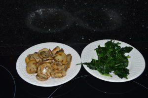 I like to cook the mushrooms with the garlic and then the spinach and set them aside first.