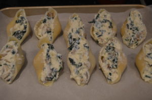 - Using a spoon, fill the shells with the cheese mixture and lay them cheese side up in the pan.