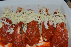 - Once all the shells are filled, spoon sauce over each shell covering the tops completely.