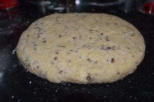 • Form the dough into a large circular disk about 1/2 inch high. (1.3 cm) It will be somewhere around 9 inches across. (23 cm) It doesn’t need to be perfect.