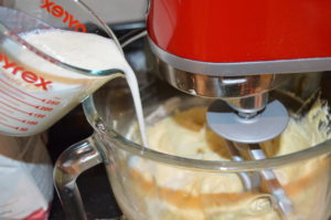 - Alternate adding the flour and buttermilk. You will start and end with the flour mixture. Add in about 1/3 of the flour mixture on low speed. Gradually increase speed to medium. Add in 1/2 of the buttermilk on low and gradually increase the speed. Repeat these steps adding the flour mixture, the rest of the buttermilk and then the rest of the flour mixture. Give the bowl a good scrape at the bottom to make sure everything is evenly mixed together.