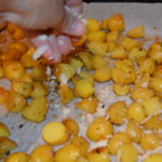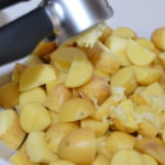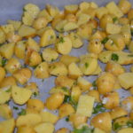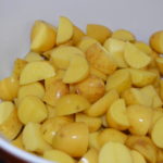Clean and rinse off your potatoes. Cut them in quarters. They don’t nee to be peeled. (The smallest potatoes, I just cut into halves.) Place all the potatoes in a large bowl.