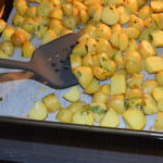 Spread the potatoes out on a parchment lined baking sheet. (I used a 16.5 x 12.5 sheet pan) The parchment will keep the Parmesan from sticking to the pan and it will also make for easier clean up later.