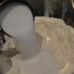- Stir the eggs/vanilla and about 1/2 cup of the half and half into the flour. Gently stir.