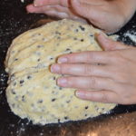 - Form the dough into a large circular disk about 1/2 inch high. (1.3 cm) It will be somewhere around 9 inches across. (23 cm) It doesn’t need to be perfect.