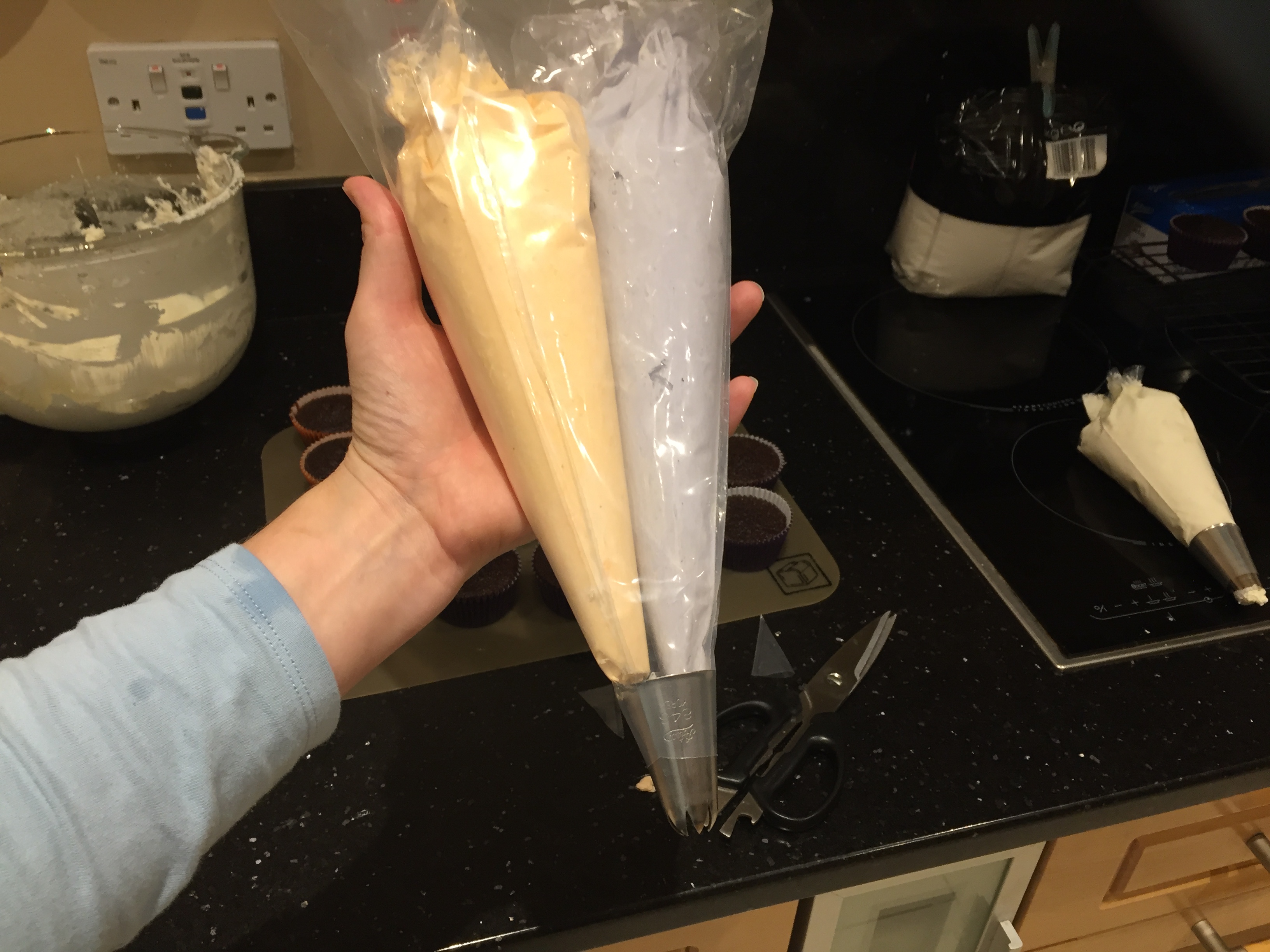 For the swirled cupcakes I used orange and purple gel color to mix into the frosting. I usually go light on the colors but if you prefer darker colors just add more gel a little at a time until you have the shade you want. I used around 1/3 of a batch of frosting for the orange and another 1/3 of the batch of frosting for the purple. Once the colors were mixed I put each color into a 12 inch piping bag without a tip on it. I twisted the end of each bag to close them. I prepared a bigger 15 inch piping bag with a large closed star tip. (Ateco 846)  I next snipped the tips off the two bags of purple and orange frosting and carefully placed them both inside the larger bag.