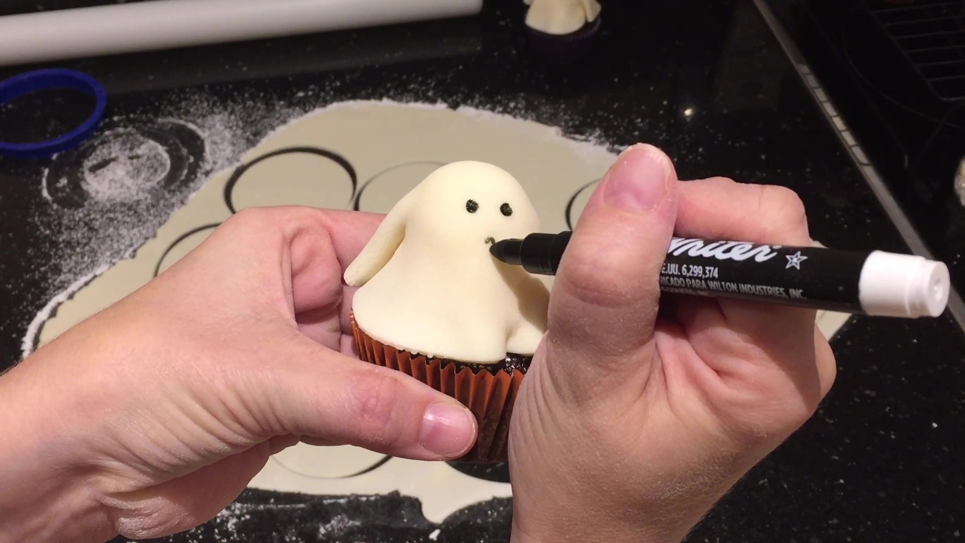 I gently patted down the fondant a little around the top and middle. Next, I used a black food marker and drew eyes and a mouth.