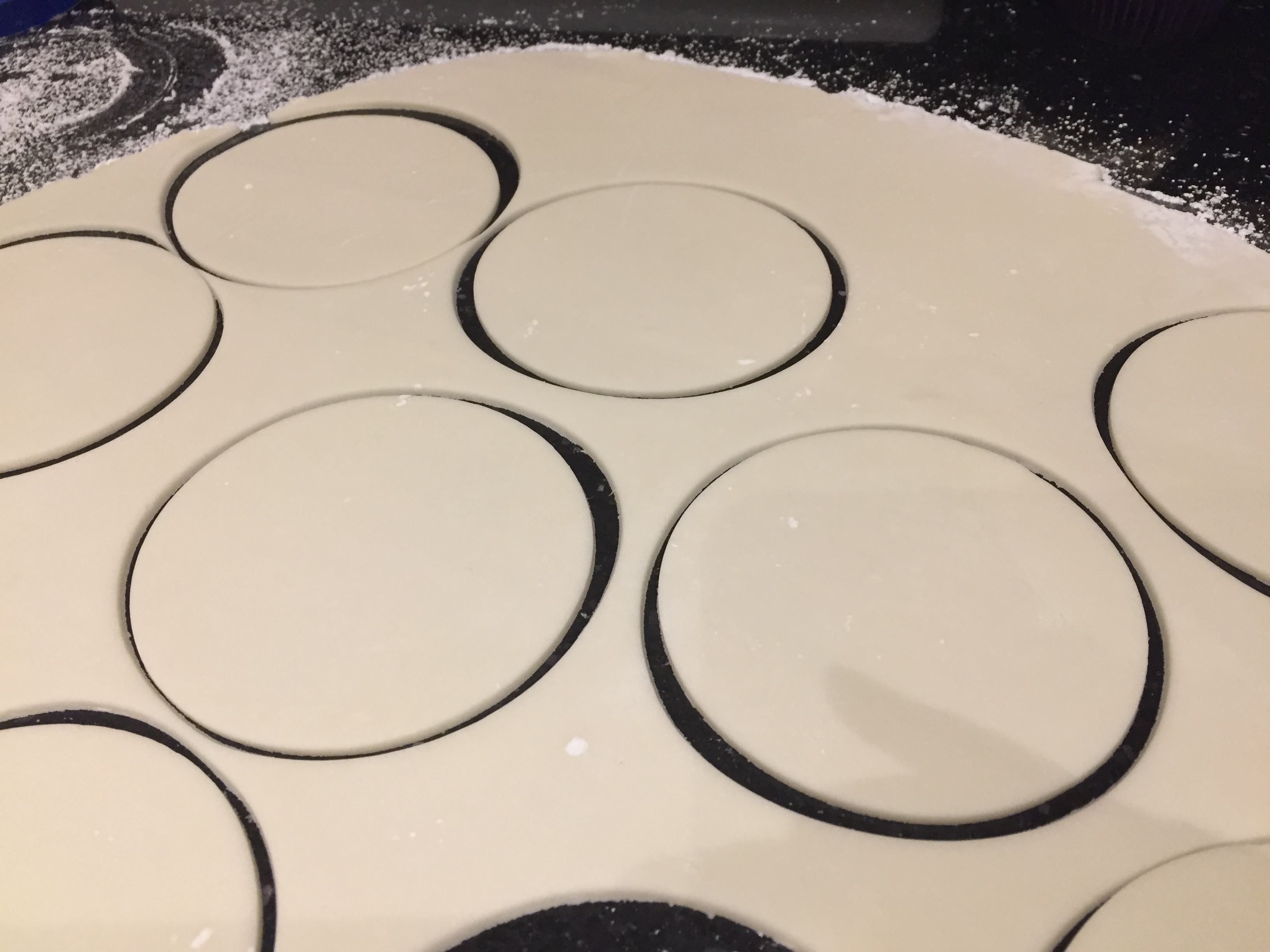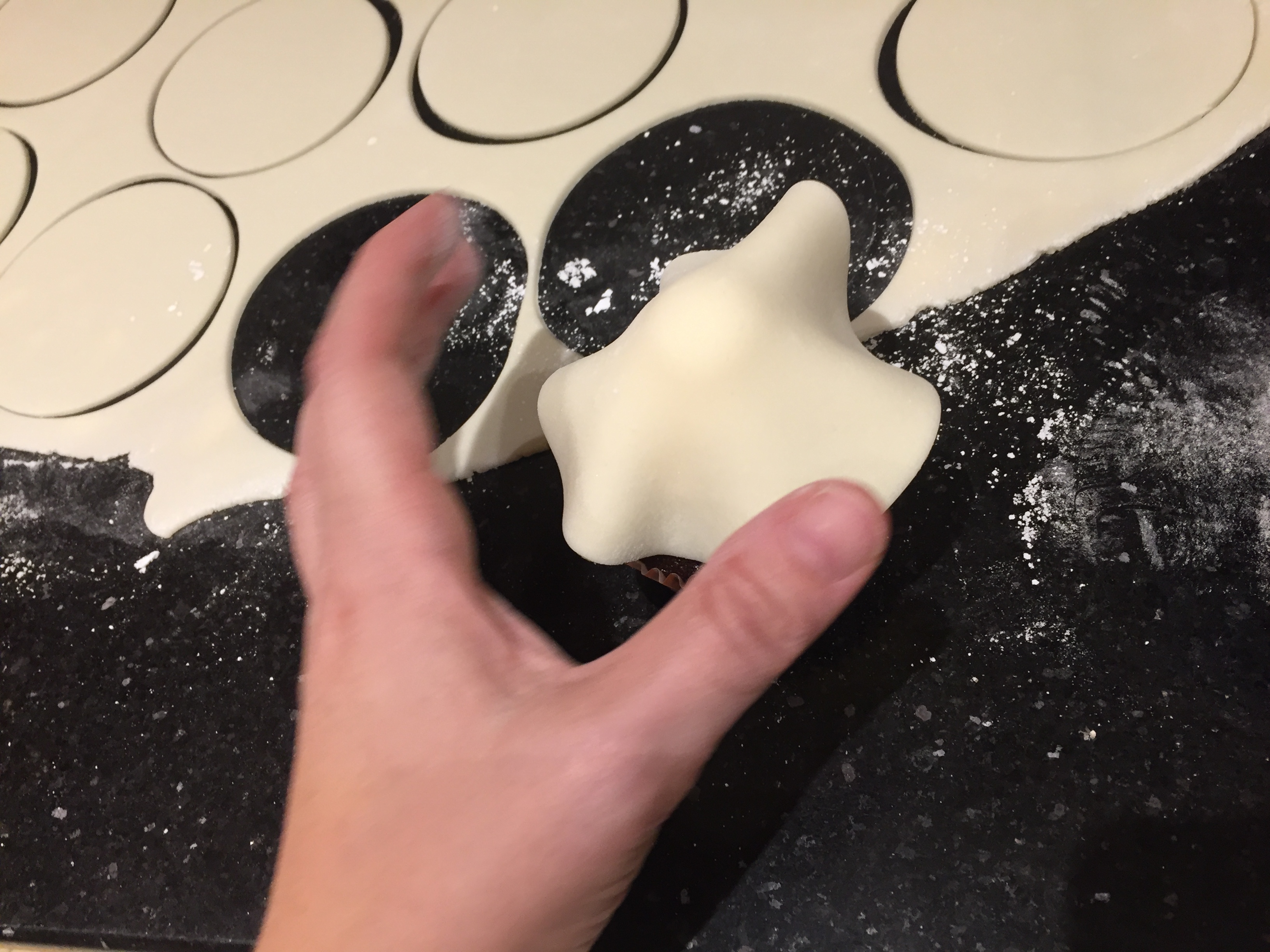 Once the cupcakes had chilled I rolled out some white fondant. It is important to roll it thin and keep checking as you roll it to make sure it is not sticking to the counter top. Keep a little confectioner sugar next to the counter in case you need a little more.