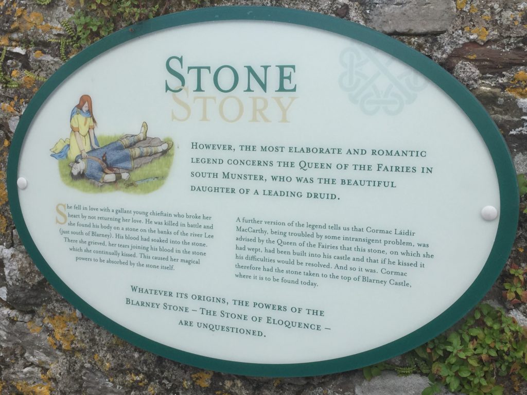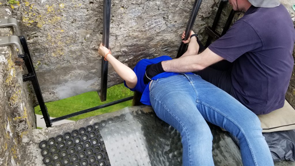 At the top of the castle there are four informational panels about the Blarney Stone. They are some of the legends about how the stone came to possess the powers that give the gift of gab. Kissing the stone itself is a little awkward. The stone is set at the bottom of a wall that now has rails built into it. In order to kiss the stone you lean over backwards while holding onto the railing. There is a person sitting right there to help get you into position. Once you kiss the stone you just slide back up. You can purchase pictures on your way out of the castle of your kiss and you are also allowed to take your own.