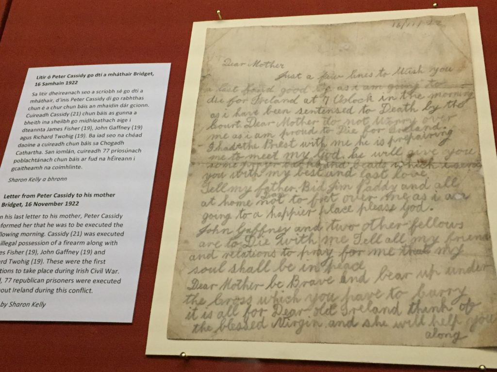 During our tour we learned about some of the leaders of the Easter Rising of 1916. I have lived in Dublin now long enough that I have heard and read about the Rising and I recognized a handful of names. The tour goes through a chapel, several floors of prison rooms and the sites outside where executions took place.