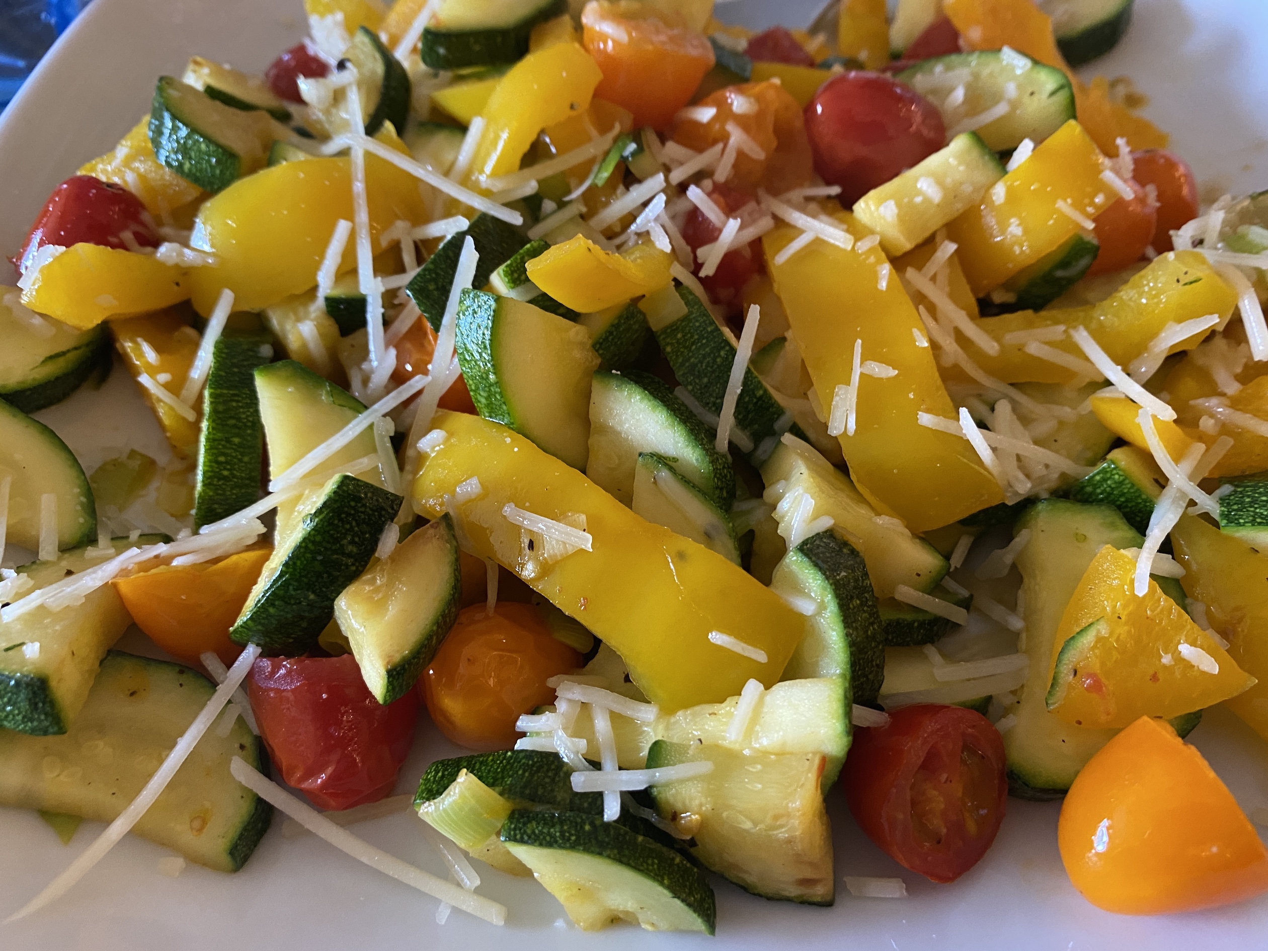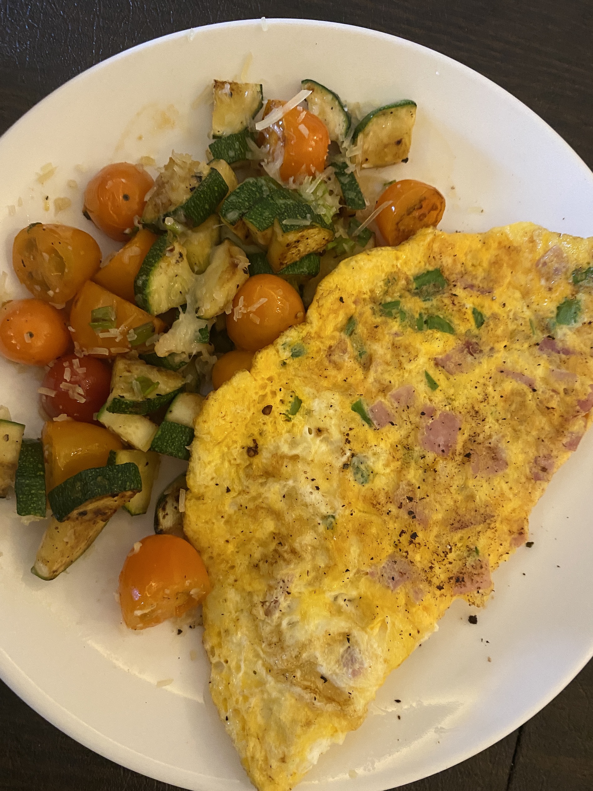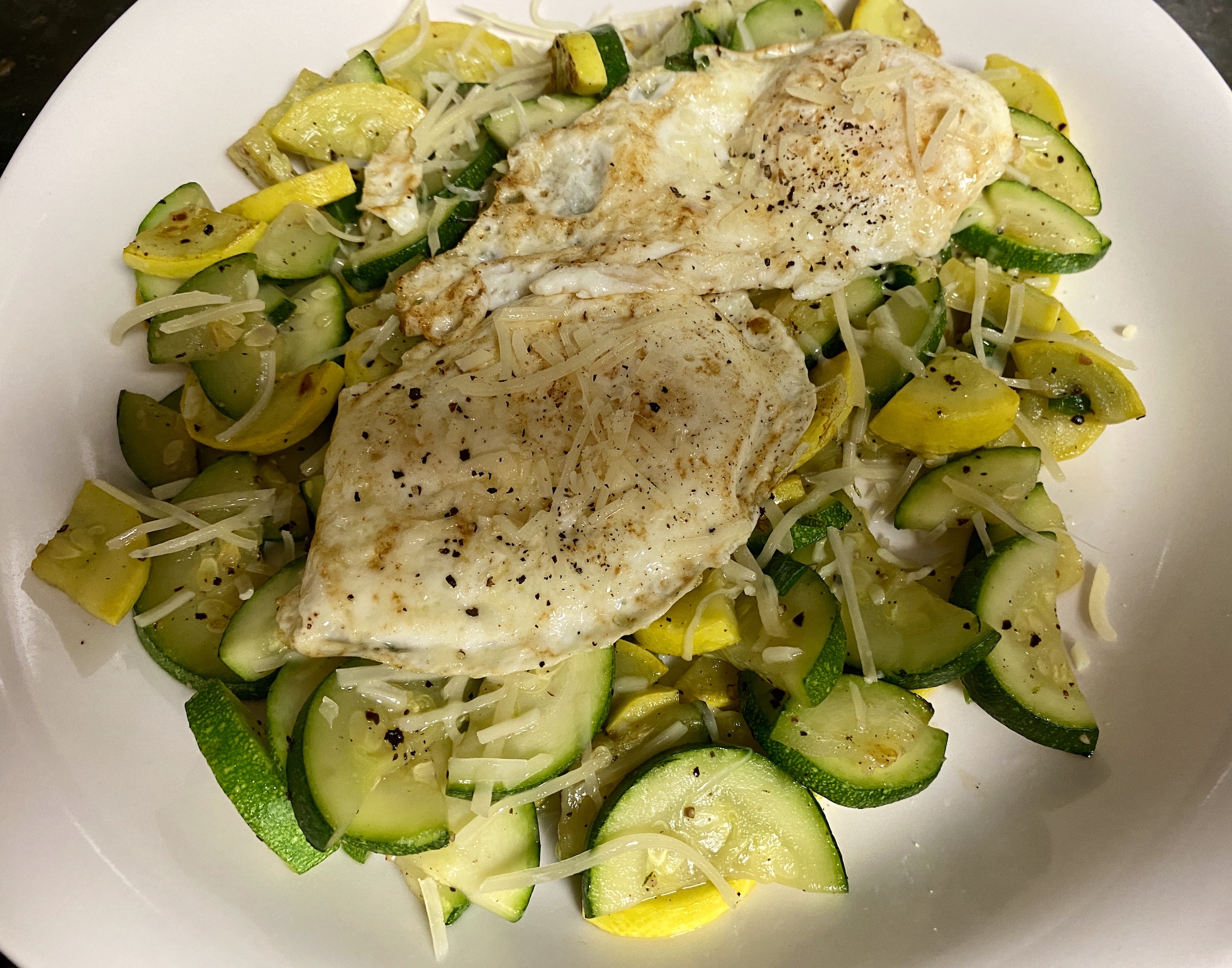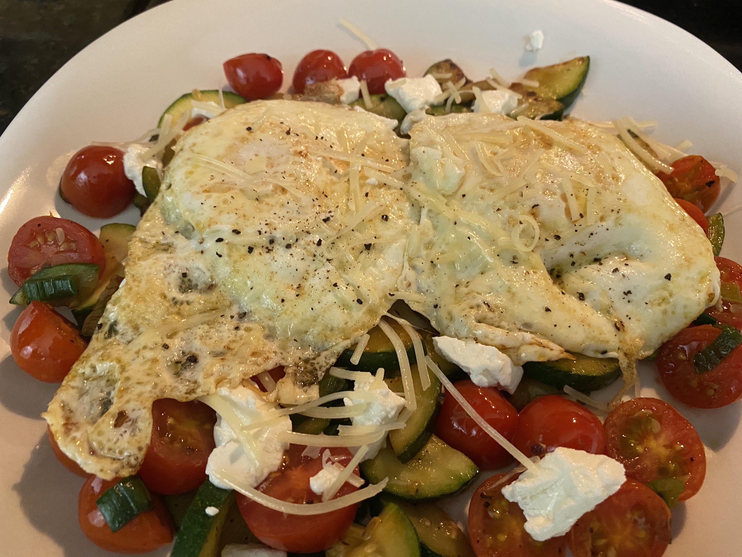 Another healthy option I love is sautéed veggies with 2 fried eggs on top. I use a little butter or coconut oil to sauté the veggies. One of the things I like about this breakfast adding whatever veggies I have on hand. I use combinations of zucchini(courgette), summer squash, peppers, spinach, tomatoes, scallions or whatever else is in season and sounds good. I always add the tomatoes at the last minute or so. This way they stay intact and just warm up a little. I season the veggies as I sauté them with a little salt and pepper. I usually top the veggies with some freshly grated parmesan and then fried eggs on top. If you don’t like cooked veggies then this one isn’t for you. I love it but the rest of my family isn’t so keen on a plate of eggs and veggies to start their day.