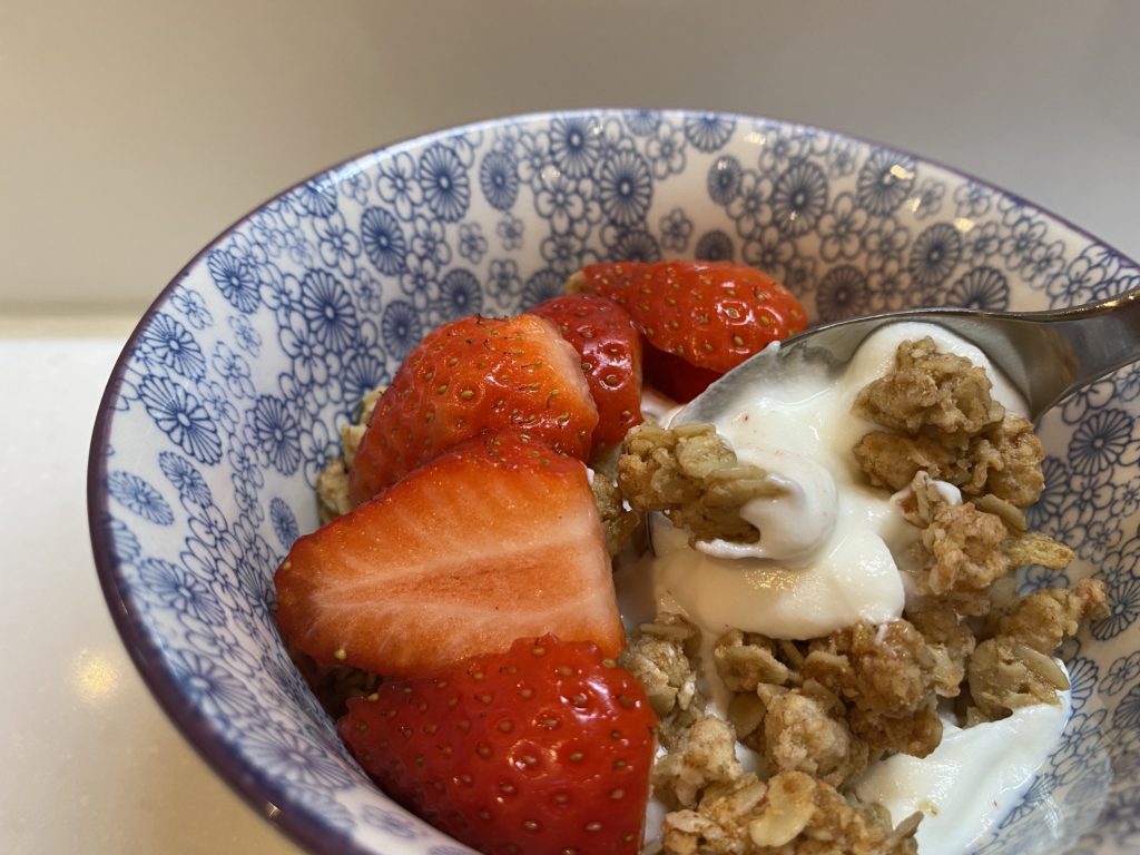 Another great option is muesli. I like it mixed into yogurt. There are so may great recipes online to make your own and you can customize your favorite flavors. The muesli isn’t overly sweet as the sweetness comes from dried fruits. Because it is uncooked I like adding to yogurt in the fridge overnight to soften. This is another breakfast that stays with me longer and I feel good about eating. Sometimes I add fresh fruit or a sprinkle of desiccated coconut. Delicious! I prefer Greek yogurt but you can use your favorite. I also like granola but it is a little different flavor. It is crunchy from being baked and usually is a little sweeter.